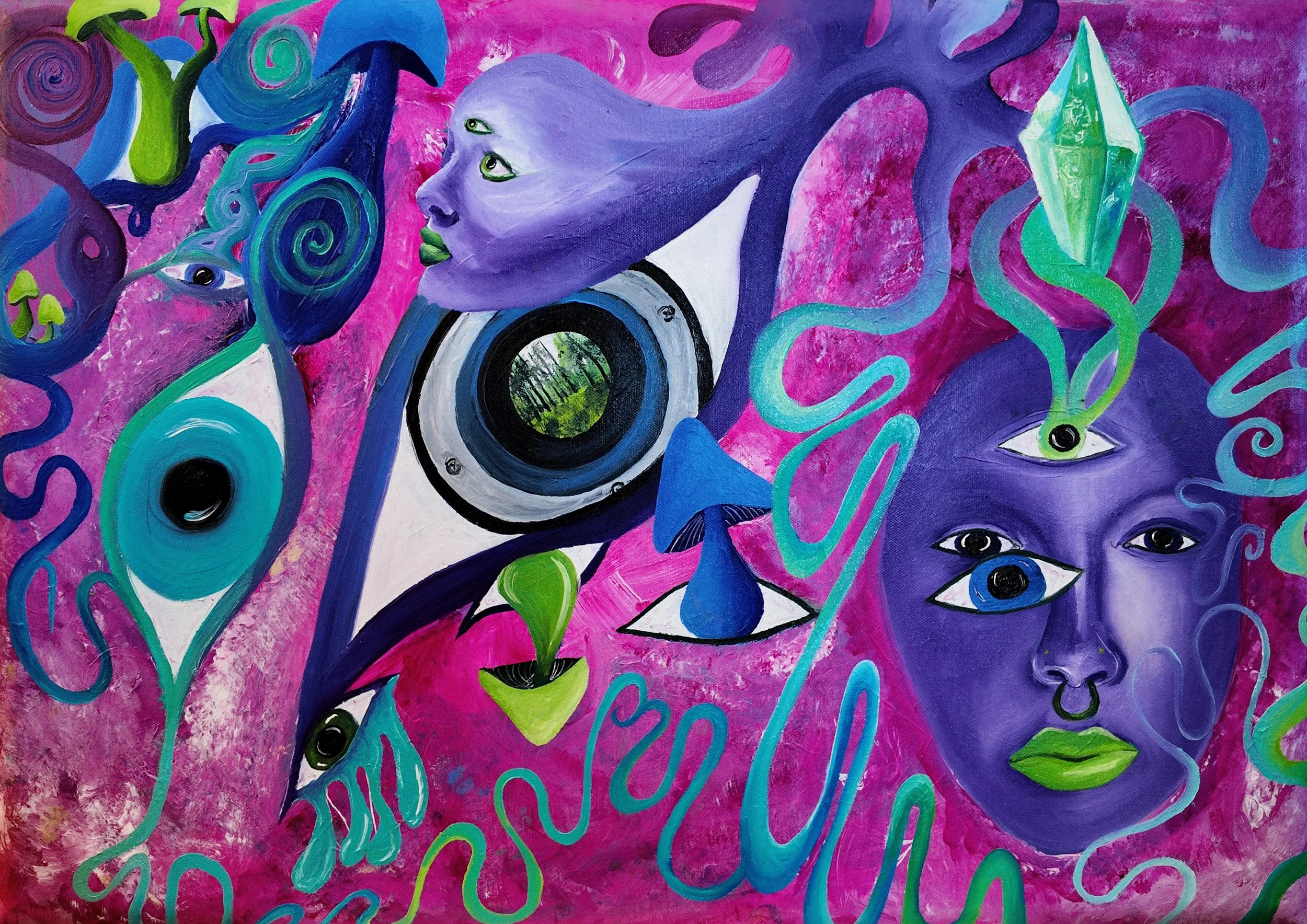 “The Awakening” feels like a mind in the act of expanding—caught between perception and transformation. The figures stretch beyond human form, as if consciousness itself is being pulled open, dissolving into the surrounding environment. Eyes appear everywhere, suggesting heightened awareness, surveillance, or even the overwhelming nature of seeing too much at once.